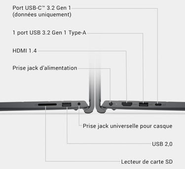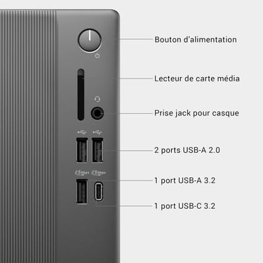 3 ports USB 3.2 + USB‑C 5 Gbps pour des transferts très rapides et de nombreux périphériques.