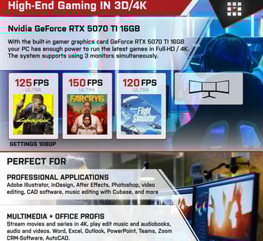 Ryzen 9 9900X et RTX 5070 Ti : puissance extrême pour FPS compétitifs, AAA récents, streaming et multitâche intensif.