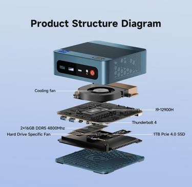 Mini PC ultra-puissant avec Intel Core i9-12900H, 32 Go de RAM DDR5 et SSD NVMe PCIe 4.0 de 1 To pour un multitâche fluide.